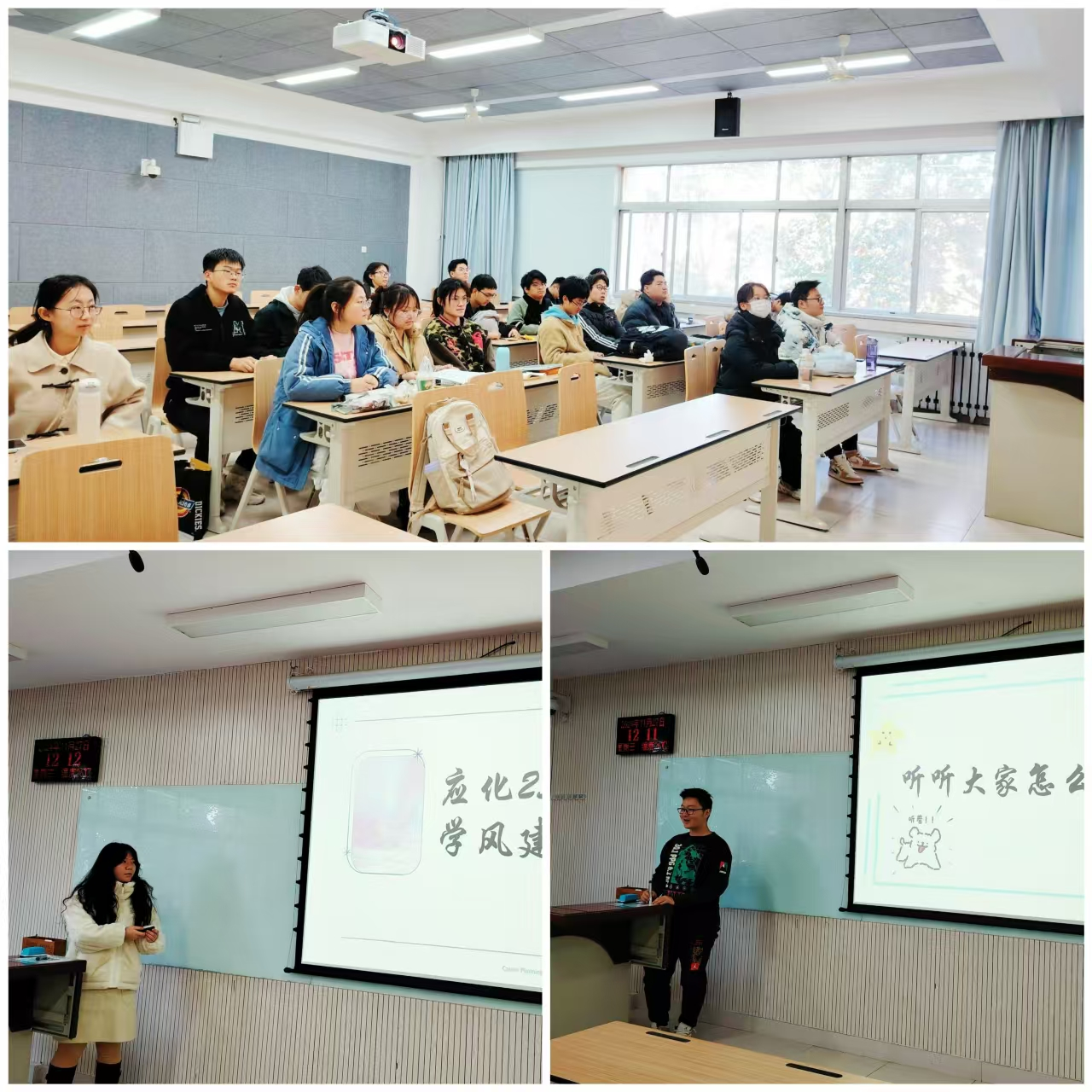 为积极响应学院学风建设系列活动的号召,进一步营造班级内尊重知识、崇尚创新、尊重人才、热爱科学的浓厚学习氛围,促进形成风清气正、求真务实的优良学习风气,应用化学2301班于11月20日在八教N8209召开了学风建设主题班会,就班规班纪及班级学习规划进行了深入探讨,班主任周文明老师及班级全体同学共同参与。