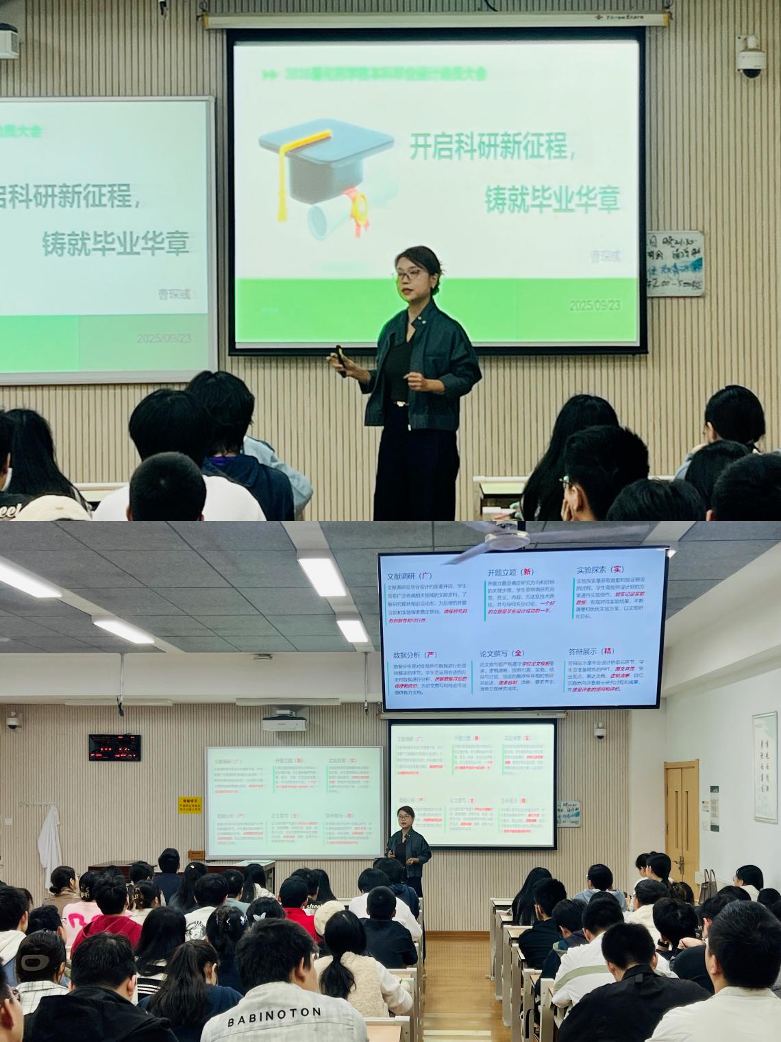 在会议上,曹琛彧副教授向同学们深入阐述了毕业论文的核心目的与基本遵循的要求。详尽地解析了毕业论文的各个关键流程,包括选题、开题报告的撰写、中期检查的具体步骤、论文的构思与撰写、查重检测的方法与重要性、评阅的标准与流程、盲审的机制以及论文答辩的技巧和注意事项。此外还结合当前流行的AI软件,为同学们拓展了视野,讲解了如何科学且合理地将这些先进工具运用到论文写作的过程中,以提升效率和准确性。